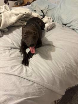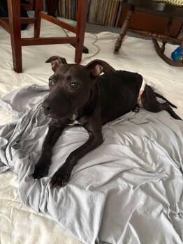 Sabel is a stunning, dark brown Staffordshire mix with a petite frame, weighing in at under 40 pounds. Though modest...