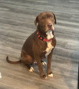 Mocha is a sweet girl, about 2-3 years old, 55 lbs and we think she is a staffie & lab...