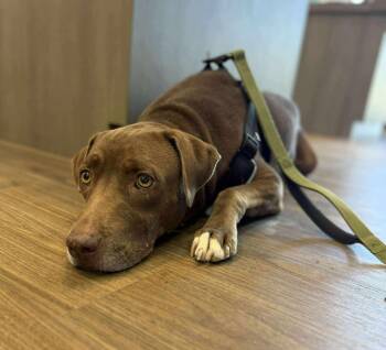 Mocha is a sweet girl, about 2-3 years old, 55 lbs and we think she is a staffie & lab...