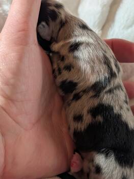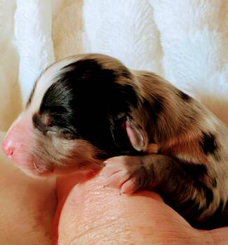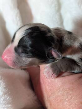 This little beautiful male is a miniature Australian Shepherd, purebred, American stock dog registry. Both his mom and father are Champion show dogs, with phenomenal proven temperament. He will mature around 30 lb.